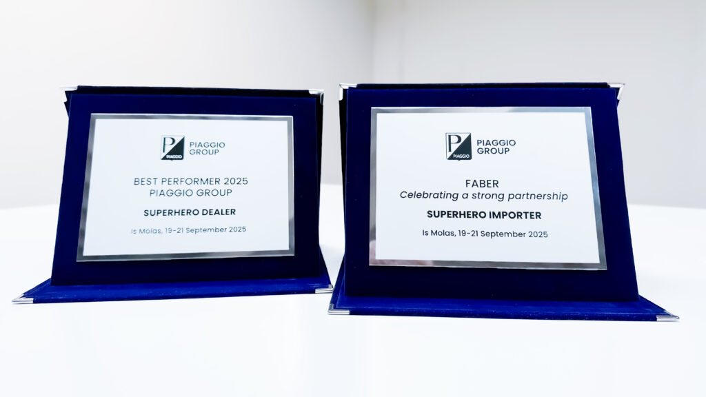 Great joy and double honor for Faber: At this year’s Superhero Dealer Meeting of the Piaggio Group in Sardinia, our team was delighted to receive two major awards.